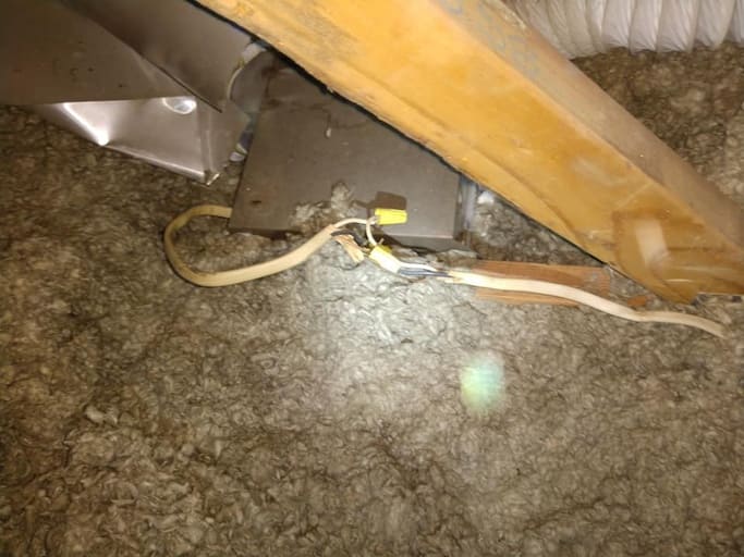This is the result of putting 100 watt light bulbs in an enclosed light fixture. The light got too hot and burned up the wiring behind the light. Fire hazard! Yikes!
